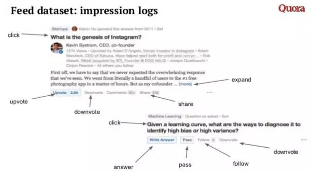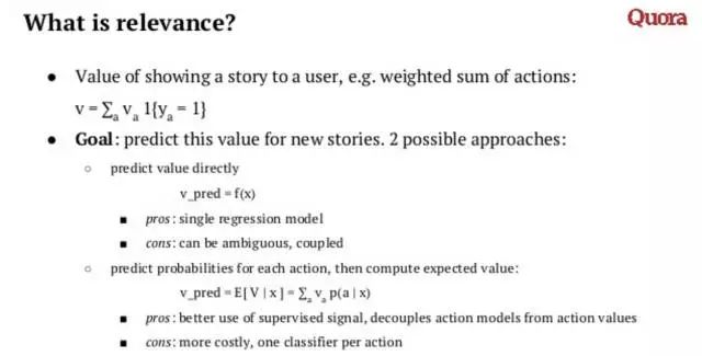 Quora做推荐的一个最核心问题就是Personalized Feed Ranking。Quora是以问题、答案与主题为核心把「知识」串联起来,然后基于用户的顶和踩等动作来划分内容质量,最后再通过人和问题的Follow关系让知识在社区内流动起来。而个人Feed正是这种「流动」的最主要的载体。Xavier说Quora做Feed Ranking的难度要比Netflix大,这也正常,没有更大的挑战想来Xavier也不会跳槽是吧。Quora Feed Ranking的首要目标是确保推送进用户Feed的内容应该是和用户兴趣高度相关的,其次还需要考虑的包括用户之间的Follow关系以及互动,Xavier管这个叫做social relevance,另外还有时间因素,比如一些和热点事件相关的问答,也应该及时地推送进用户Feed。