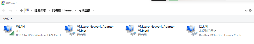 此时电脑主机的网卡信息如上,WLAN 为主机外接网络, 以太网 为闲置网口, VMware_Network_Adapter 为虚拟网卡(VMnet1 为虚拟交换机,均为虚拟机 host_only 使用), VMware_Network_Adapter 为虚拟网卡(VMnet8 为虚拟交换机,均为虚拟机 NAT模式 使用),虚拟机默认使用 NAT 模式,VMnet8 的ip 即为虚拟机模拟网卡ip