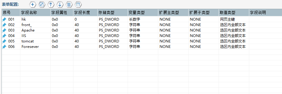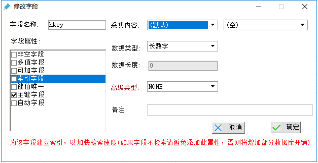 表格的主键的变量类型,根据表格的行数长度,选择“Integer”或者“Long”。取值类型选择“空”。字段属性选择“主键字段”和“自动字段”(选择主键字段后,软件会自动选择“键值唯一”和“索引字段”。)