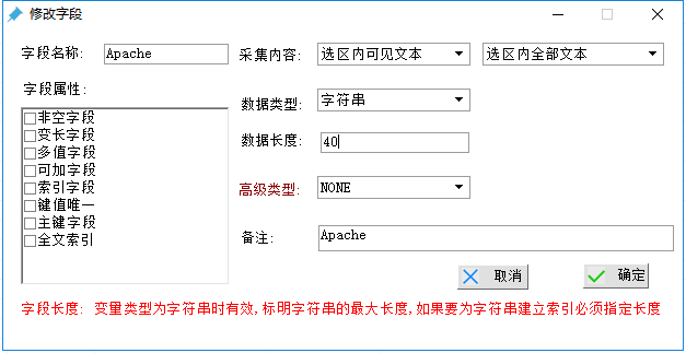 其他字段的变量类型选择“string”,取值类型选择“选区内全部文本”。(>>字段参数)