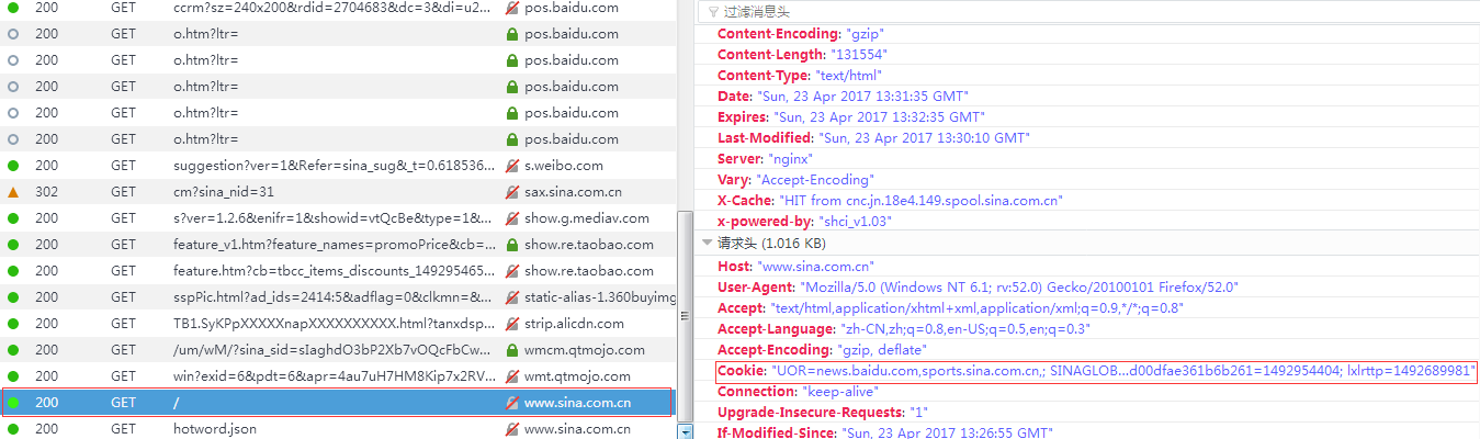 如上图所示,我们访问了新浪网,通过火狐浏览器的调试窗口可以看到cookie存在于请求头也就是httprequest中,并且是以键值对(数组)的形式存在。