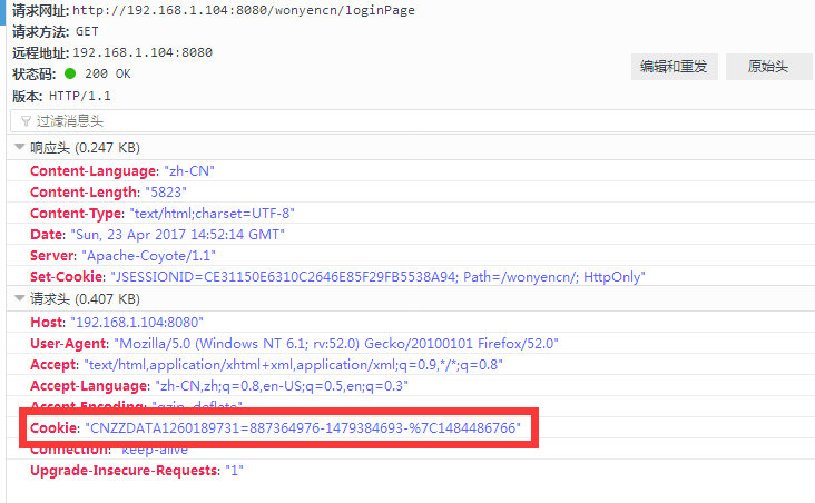 当我们再次访问该网站上的其他页面的时候,在请求头都将带有这个cookie。如下图所示。