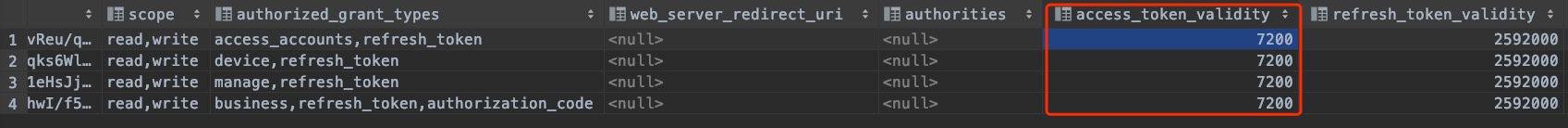 JDBC方式是ApiBoot OAuth无法控制的,因为OAuth2当使用JDBC方式进行存储客户端、令牌等信息时,都是通过OAuth2提供的固定的表进行操作,正因为如此我们只需要修改oauth_client_details表内每一条client信息的access_token_validity字段的值即可,时间单位同样也是秒,如下图所示: