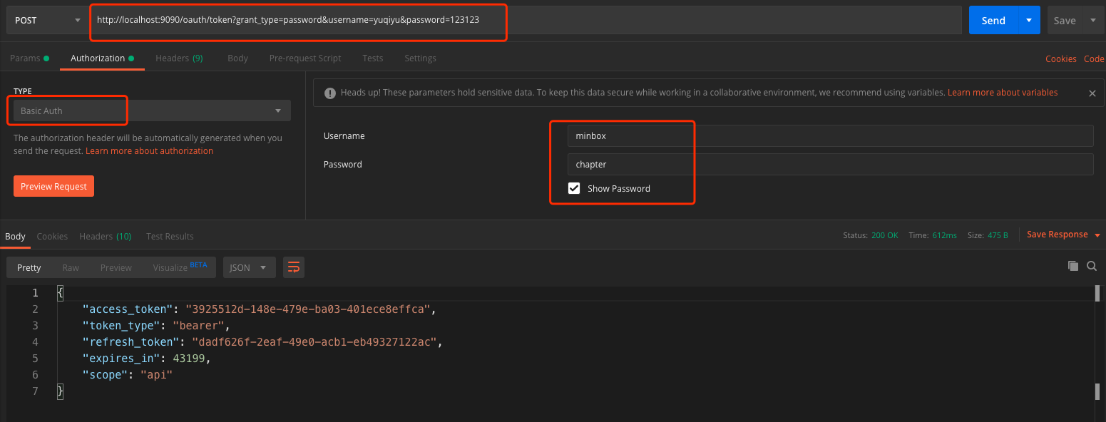 ➜ ~ curl -X POST minbox:chapter@localhost:9090/oauth/token -d 'grant_type=password&username=yuqiyu&password=123123'