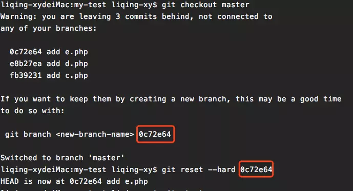 所以,虽然此时HEAD所指向的内容正是我们所需要的,但是master分支是没有任何变化的,git只是将C~E部分的提交内容复制一份粘贴到了master所指向的提交后面,我们需要做的就是将master所指向的提交id设置为当前HEAD所指向的提交id就可以了,即: