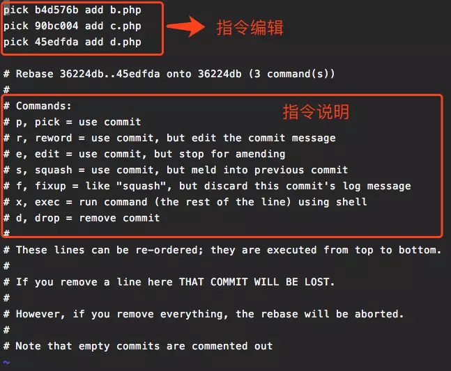 上面未被注释的部分列出的是我们本次rebase操作包含的所有提交,下面注释部分是git为我们提供的命令说明。每一个commit id 前面的pick表示指令类型,git 为我们提供了以下几个命令: