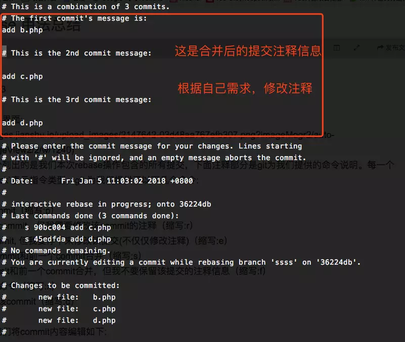 其中-i的意思是--interactive,即弹出交互式的界面让用户编辑完成合并操作,[startpoint] [endpoint]则指定了一个编辑区间,如果不指定[endpoint],则该区间的终点默认是当前分支HEAD所指向的commit(注:该区间指定的是一个前开后闭的区间)。