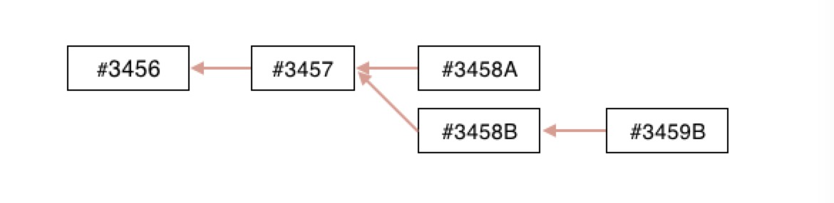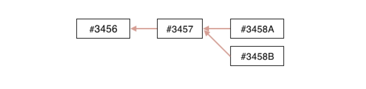 当这个两个区块传播时,一些节点首先收到 #3458A, 一些节点首先收到 #3458B,这两个候选区块(通常这两个候选区块会包含几乎相同的交易)都是主链的延伸,分叉就会产生,这时分叉出有竞争关系的两条链,如图: