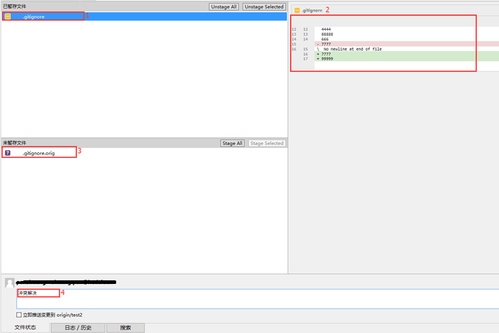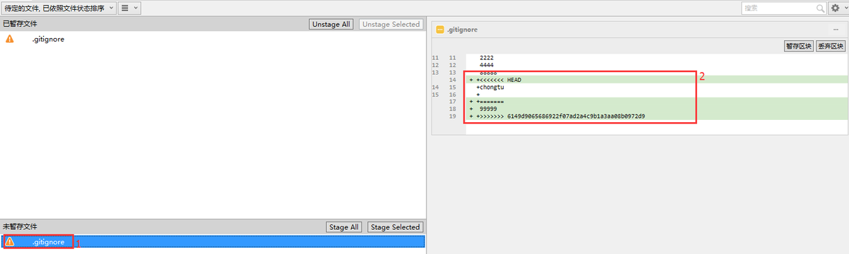 1、点击未暂存区域的冲突文件。