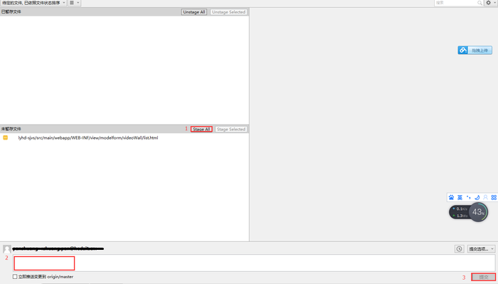 点击Stage All,填写提交信息既可以将本地内容(暂存区)提交到本地版本库,如图所示: