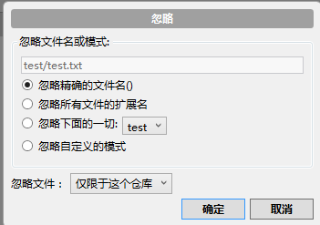 鼠标右键要忽略的文件,点击“忽略”,选择忽略的模式,即可将文件进行忽略,如图所示: