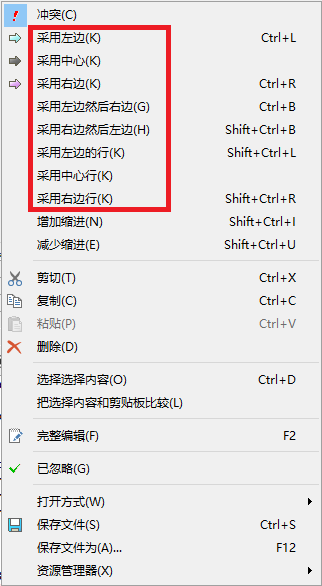方法一:在相关的版本处,选中”冲突行”,合并区默认处于合并位置,鼠标右键,选择最终冲突地方留下的内容,如图: