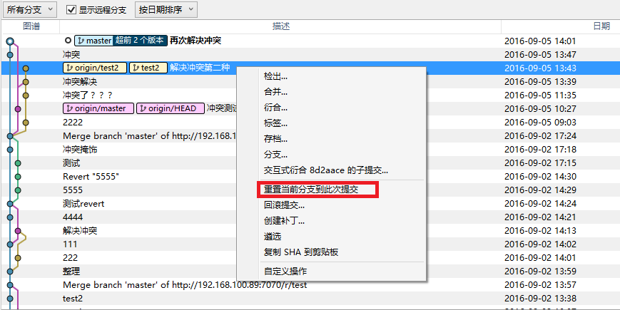 3、鼠标右键,选择“重置当前分支到此次提交”