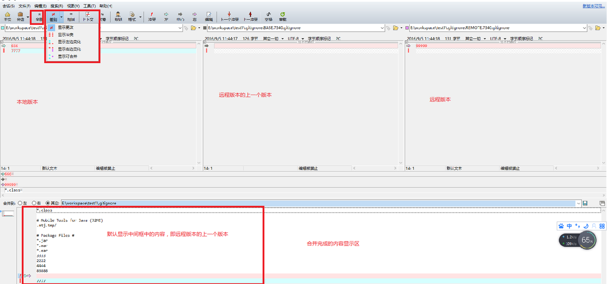 冲突解决界面如下:可以根据需要选择内容显示类型,只”显示更改“,”显示冲突“或者”全部“