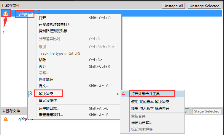 备注:区分于第一种方式,使用第一种方法解决时,不要点击”未暂存文件”,否则可能无法打开冲突文件