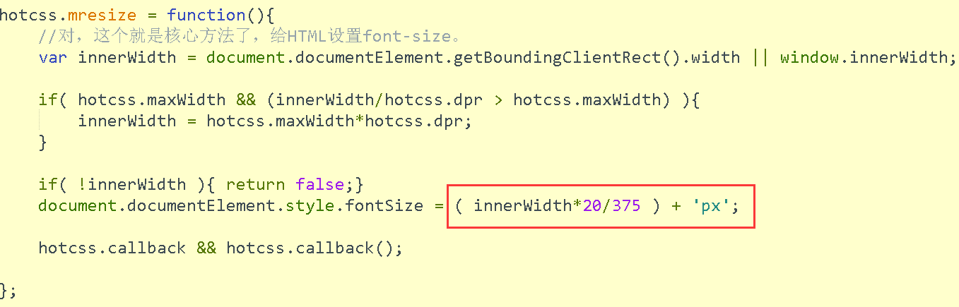 根据源码中的计算公式 innerWidth*20/320求375*20/320 = 23.4375。也就是说在375px的屏幕下html根元素字体为23.4375px,我们在编码的时候要将所有的尺寸除以23.4375来转换成rem。