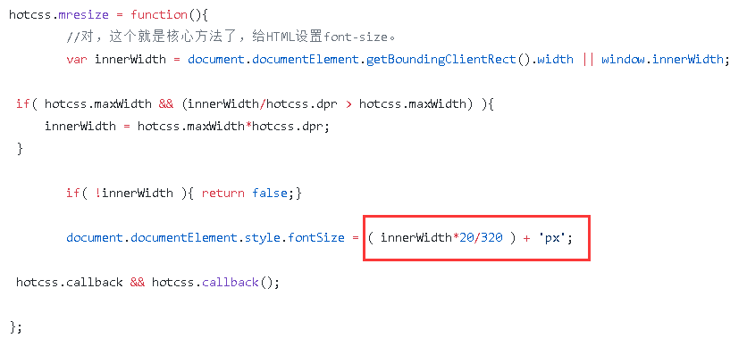 hotcss默认以640px的设计稿来计算html根字体大小,通过以下代码计算出在320px的屏幕下,html根元素字体大小的值: