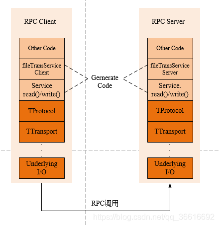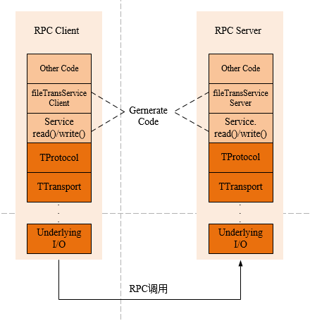 Thrift是一个典型的C/S结构,用户在thrift描述文件(IDL)中声明自己的服务,包括相关数据结构定义和服务接口声明;通过代码生成工具生成服务端和客户代码(可以为不同语言),开发人员在服务端实现服务,在客户端调用服务即可实现不同语言间的远程服务调用。
