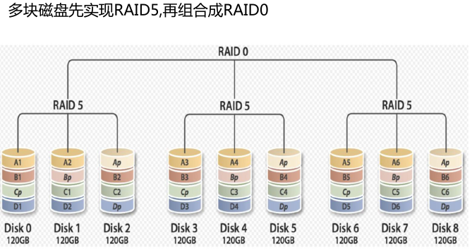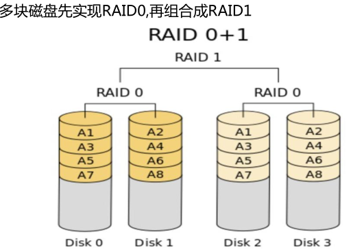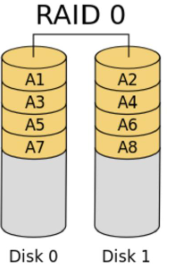 如:disk0,disk1,disk3组成一个RAID-0,假设为/dev/sda(三块硬盘的总容量组合而成的),要求三块硬盘的容量相同,如果不同,就取最小的容量*3=总容量。逻辑上把三块硬盘合到一起用,系统并不知道,这样就实现了跨硬盘分区,然后创建文件系统,挂载,向这块硬盘中写入数据。假如往/sdv/sda上写100M的数据,会把100M的数据切成小块,这个小块就叫做 chrunk, 假设这个小块为512k,依次将小块chrun 512k向三块硬盘中写入,实现了并行写入,这样效率提高 了很多。如果任何一个硬盘坏了,数据就被破坏了,没有容错能力。RAID-0又叫做条带卷(strip)。