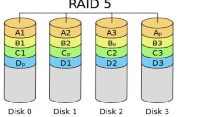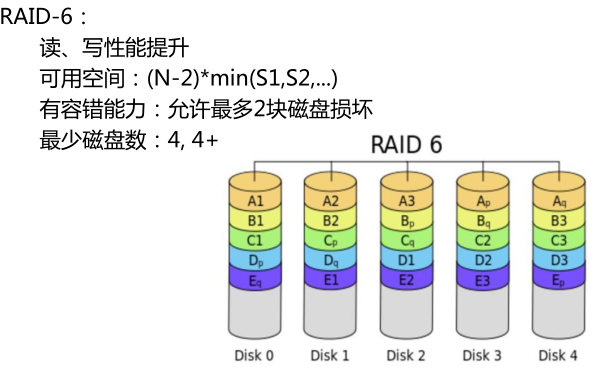 - 多块数据盘异或运算值存于专用校验盘。校验盘压力很大