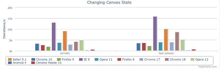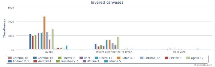 让我们来讨论一下移动平台。不幸的是在写这篇文章的时候,只有IOS 5.0beta 上运行的Safari1.5拥有GPU加速的移动平台canvas实现。如果没有GPU加速,移动平台的浏览器一般没有足够强大的CPU来处理基于canvas的应用。上述的JSperf测试用例在移动平台的运行结果要比桌面型平台的结果糟糕很多。这极大的限制了跨设备类应用的成功运行。
