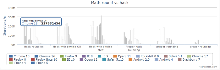 为了处理飞速变化着的HTML5 canvas, JSPerf ( jsperf.com )测试证明了我们在文中提到的每一个方法目前都还生效。JSPerf是一个十分有用的web应用程序,web开发者们可以利用此程序编写JavaScript 性能测试用例。每一个测试用例只关注你企图达到的某一方面的结果(比如说清楚画布),每一个这样的测试用例包含有若干个能够达到同一结果的不同方法。JSPerf在一小段时间内尽可能多的运行每一个方法,并没给出一个统计学上有显著意义的每秒中迭代次数。高分意味着更高的性能。浏览者可以在自己的浏览器中打开JSPerf 性能测试页面,而且可以让JSPerf把标准化的测试结果存储在Browserscope(broserscope.org)中。因为本文中提到的优化技术已经备份到了JSPerf的结果中,因此你可以重新运行查看最新的信息以确定相应的方法是否还有效。我已经写了一个小的帮助应用程序(helper applicatin)来将测试的结果绘制成图表嵌入到整篇文章中。