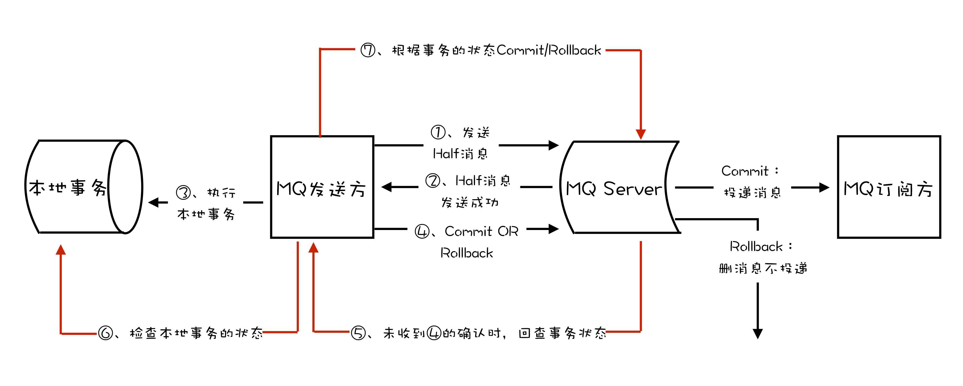 综合上面讲的通用事务消息的实现和 RocketMQ 的事务反查机制,使用 RocketMQ 事务消息功能实现分布式事务的流程如下图: