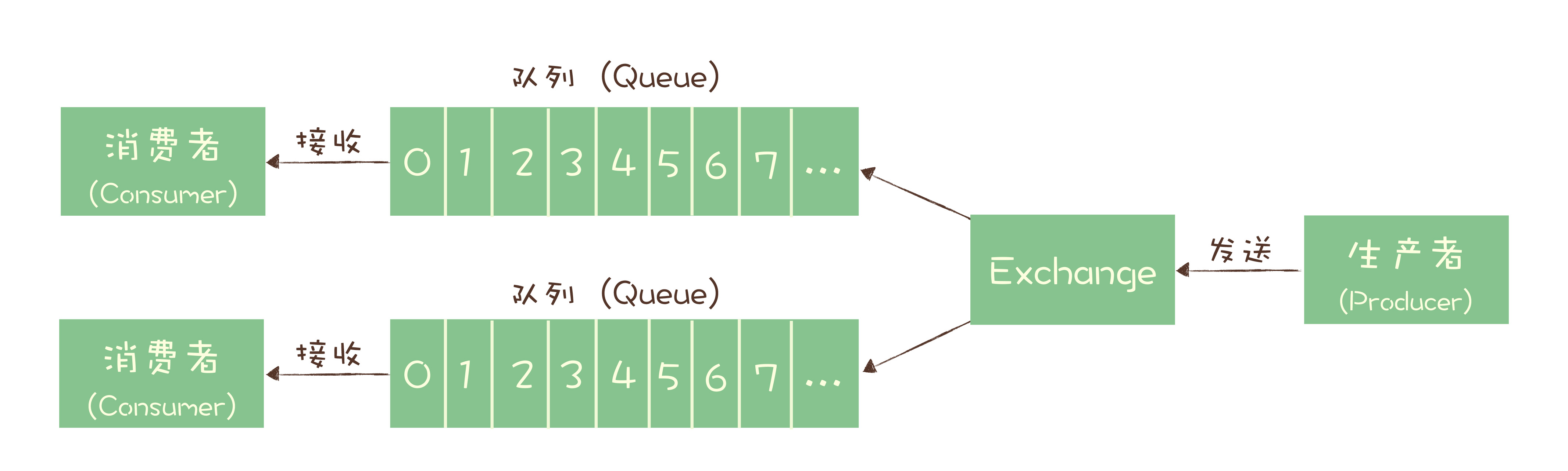 显然这是个比较蠢的做法,同样的一份消息数据被复制到多个队列中会浪费资源,更重要的是,生产者必须知道有多少个消费者。为每个消费者单独发送一份消息,这实际上违背了消息队列“解耦”这个设计初衷。