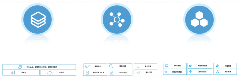 基础架构安全依赖于云厂商或者是专有云一些基础设施安全能力,也包括 RAM认证,细粒度RAM授权,支持审计能力等等。