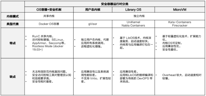 接下来分享下业界在安全容器运行时的一些方案对比,业界安全容器运行时分为四大类: