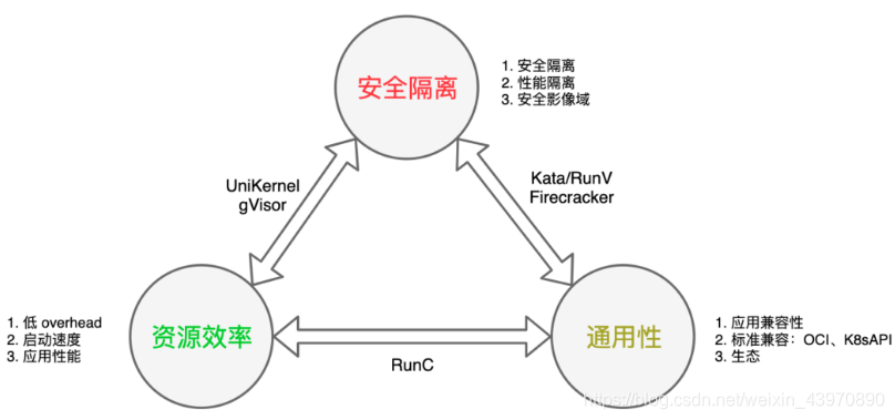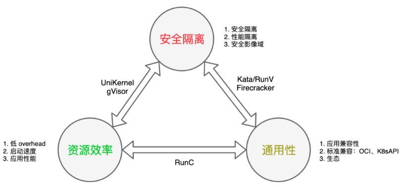 用户选择安全容器运行时需要考虑三方面:安全隔离、通用性以及资源效率。