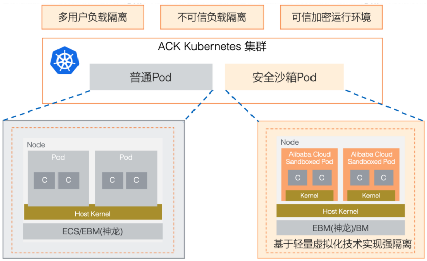 我们阿里云容器服务 ACK 产品基于 Alibaba Cloud Sandbox 技术在 2019 年 09 月份推出了安全沙箱容器运行时的支持,它是在原有Docker容器之外提供的一种全新的容器运行时选项,它可以让应用运行在一个轻量虚拟机沙箱环境中,拥有独立的内核,具备更好的安全隔离能力,特别适合于多租户间负载隔离、对不可信应用隔离等场景。它在提升安全性的同时,对性能影响非常小,并且具备与Docker容器一样的用户体验,如日志、监控、弹性等。