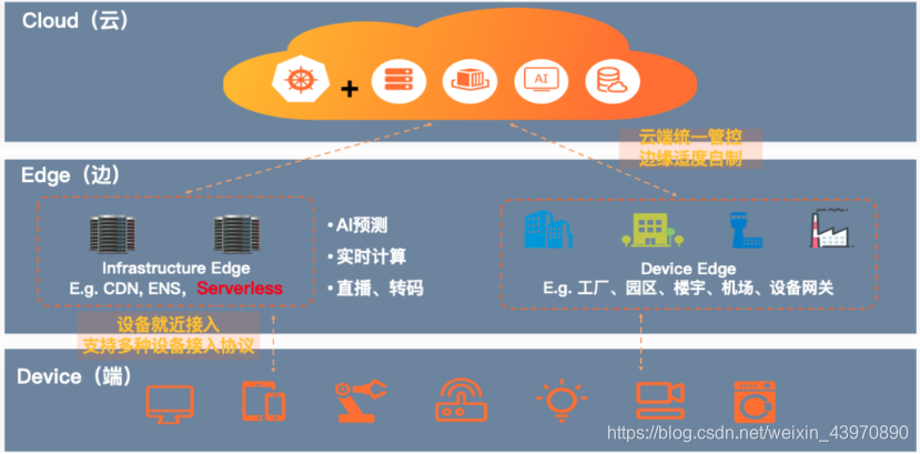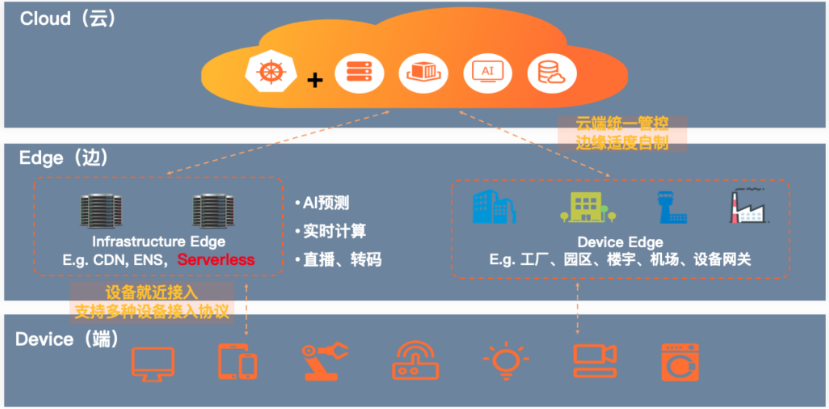“边”又分为两大类;一个是工业级的边,这类比较典型代表是云厂商提供的 CDN 节点计算资源、服务或者 Serverless 等,工业级的边也可提供 AI 预测、实时计算、转码等服务能力,把云上的服务下沉到边侧。第二类是用户或者工厂、园区、楼宇、机场等自己提供计算资源服务器或者网关服务器,如一个家庭网关可以作为边缘节点接入到集群中从而可以纳管控制家庭中的智能电器设备。