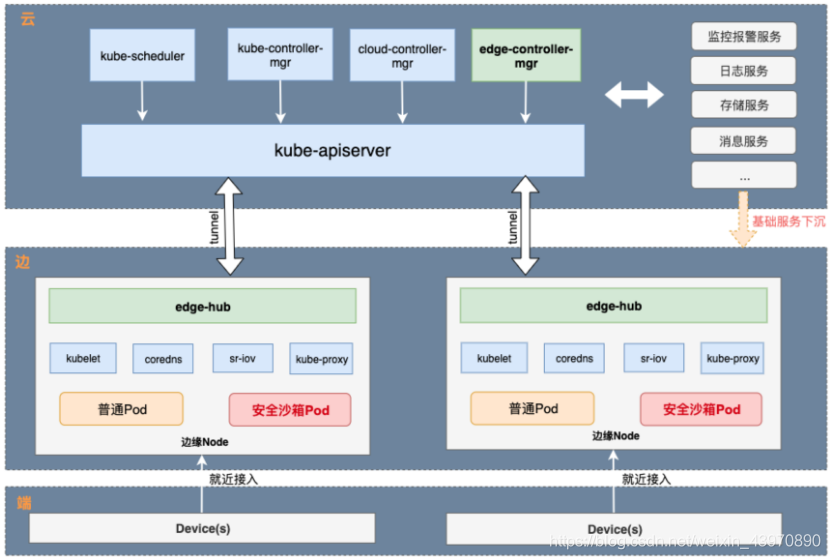 先来看下典型的边缘云模型,它由云(侧)、边(侧)、端(侧)三部分共同组成,三者相互协同,并提供统一的交付、运维和管控标准。云侧统一管控,是整个模型的中枢大脑;边侧由一定计算/存储能力的节点组成,是距离设备和用户最近的计算/存储资源;亿万端侧设备就近计入“边缘节点”。