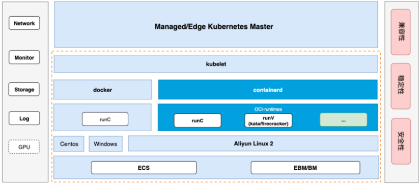 OS 我们选择了阿里云的发行版 OS:Aliyun Linux,4.19+ 的 Kernel 对容器的兼容性更优、稳定性更好,同时我们对其进行了极少的定制,以便支持硬件虚拟化。