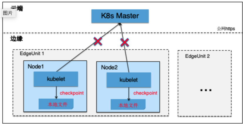 - K8s 管控端与边缘节点断网维护,如工厂封网内部设备维护等,超过 Pod 容忍时间(默认300s)后会导致管控端发出“驱逐失联节点上所有 Pods”指令,在维护结束网络恢复后,边缘节点收到驱逐指令删除所有应用 Pod,这对于一个工厂来说是灾难性的。