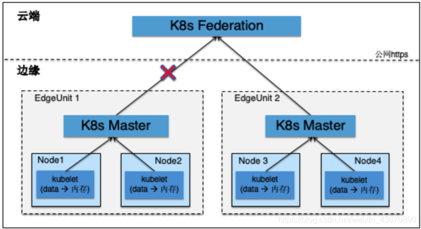 利用集群联邦,把整个 K8s 集群下沉到边缘侧,如每个 EdgeUnit 存在一个或多个 K8s 集群,通过云侧的 K8s Federation 进行多集群/负载管理。但因为 EdgeUnit 分散性且规模较大庞大,会导致集群规模数倍增加,产生大量的 Overhead 成本,很多 EdgeUnit 内通常仅有几台机器。而且这种架构也比较复杂,难以运维,同时,边缘K8s集群也很难复用云上成熟服务,如监控、日志等。