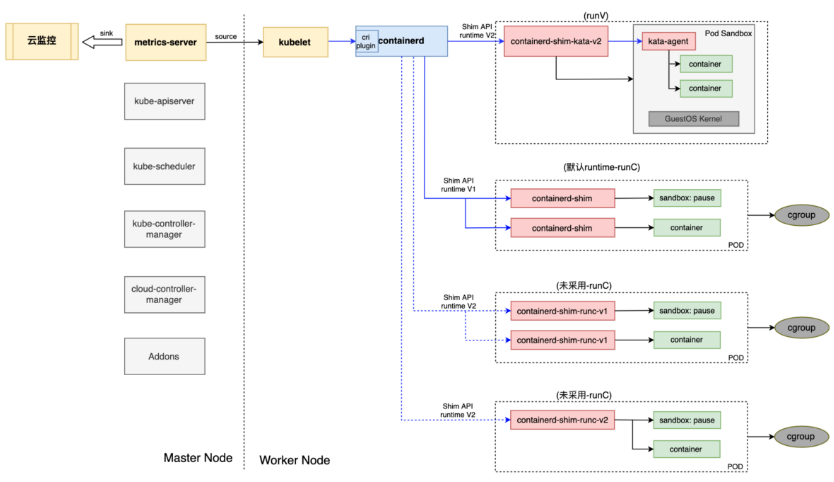 - containerd-shim-kata-v2 通过虚拟串口向 VM GuestOS(POD) 内的 kata-agent 请求监控数据,kata-agent 采集 GuestOS 内的容器监控数据并响应。