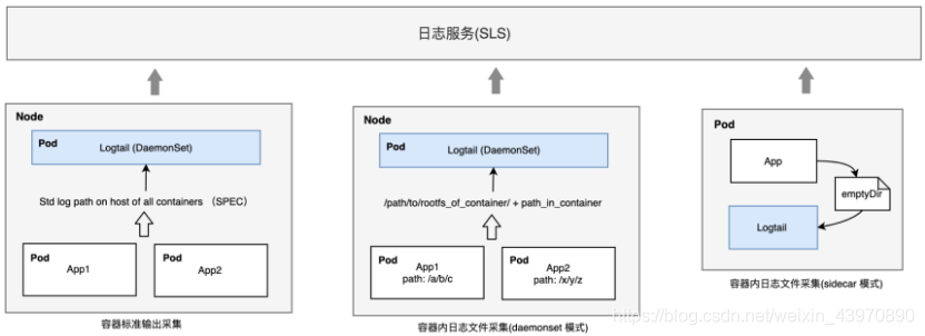 上图是我们的日志方案,我们需要通过阿里云日志采集 Agent Logtail 采集容器日志,主要有三种使用方式: