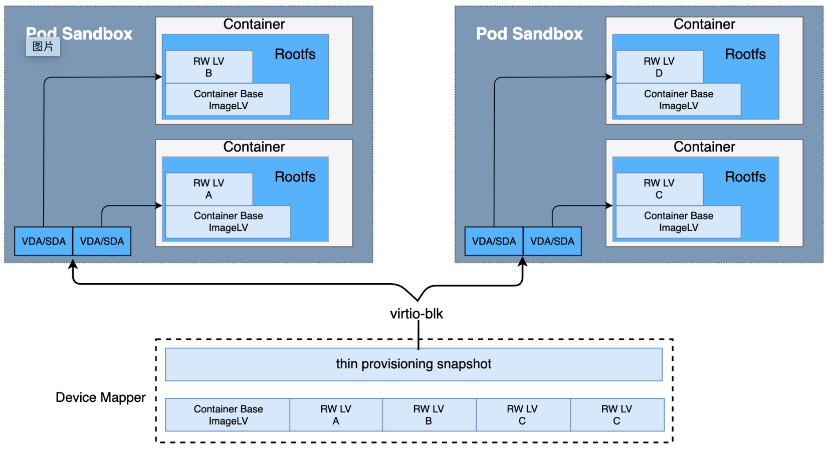 对于安全沙箱容器场景中容器 RootFS 我们并没有采用默认的 overlayfs,主要是因为 overlayfs 属于文件目录类,在 runC 把 rootfs 目录 mount bind 到容器内没有任何问题,但在 安全沙箱容器 kata 上直接 mount bind 到容器内会经过 kata 的 9pfs,会导致 block io 性能下降数十倍,所以 我们采⽤ devicemapper 构建了⾼速、稳定的容器 Graph Driver,由于 devicemapper 的底层基于 LVM,为每个容器分配的 dm 均为一个 block device,把这个设备放入容器内就可以避免了 kata 9pfs 的性能影响,这样就可以实现一个功能、性能指标全⾯对⻬ runC 场景的 RootFS。