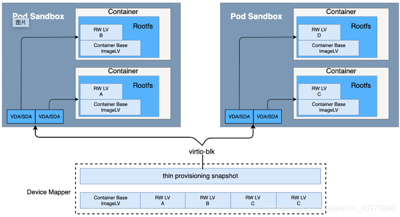- 采用 devicemapper snapshot 机制,实现镜像分层存储;