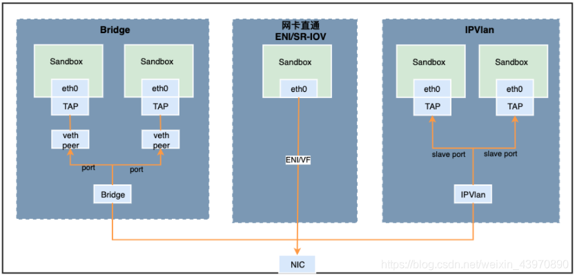 从 Ping 时延、不同带宽、TCP_RR 和 UDP_RR 多个方面同时对比了这几种网络方案,Host作为基准。可以看出,直通网卡的性能可以做到接近host的性能,ipvlan和bridge与直通网卡方式有一定差距,但前两者通用性更好;总体来说 ipvlan 比 bridge 性能普遍更好。