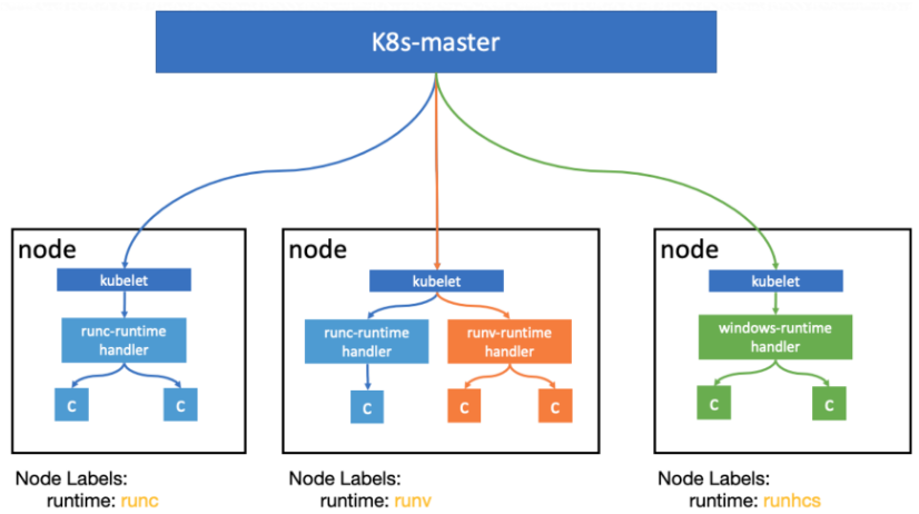 低于 1.16.0 版本的 K8s 调度器不支持 RuntimeClass,需要先给节点打上运行时相关的 Label,然后再通过 runtimeClassName 配合 NodeSelector 或 Affinity 完成。