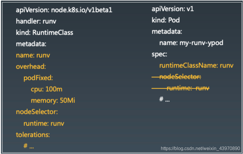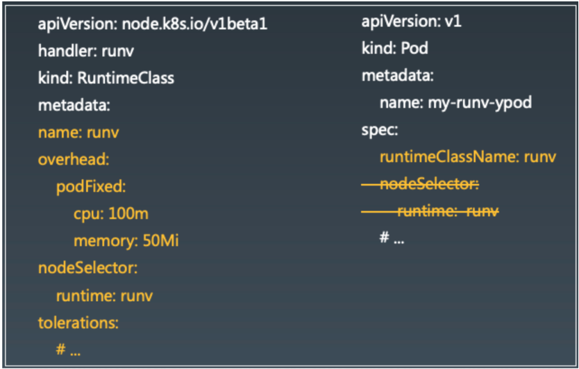从 K8s 1.16.0 版本开始,对 RuntimeClass 调度的支持得以改善,但从实现上,并不是在 kube-scheduler 的新增对 RuntimeClass 支持的算法,而是在 RuntimeClass API 上新增了 nodeSlector 和 tolerations,此时用户的 pod 上只需要指定 runtimeClassName 而无需指定 nodeSelector 或 affinity, kube-apiserver 的 Admission WebHook 新增了 RuntimeClass 的 Mutating,可以自动为 pod 注入 pod.spec.runtimeClassName 所关联的 RuntimeClass 对象里配置的 nodeSelector 和 tolerations ,从而间接地支持调度。
