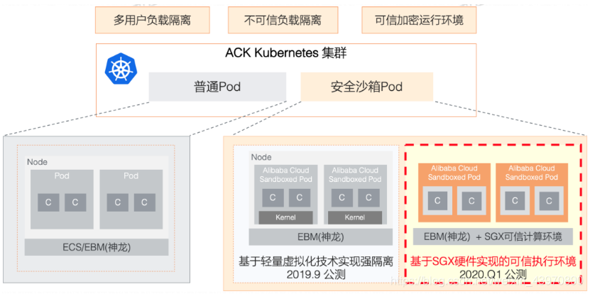 在此背景下,我们联合了多个团队,在 ACK 上研发了基于 Intel SGX 硬件加密的 TEE 运行时,可让用户的应用的跑在一个更加安全、可信的运行时环境中,帮助更多的用户破除上云的安全障碍,我们也将在 2020年Q1进行公测。