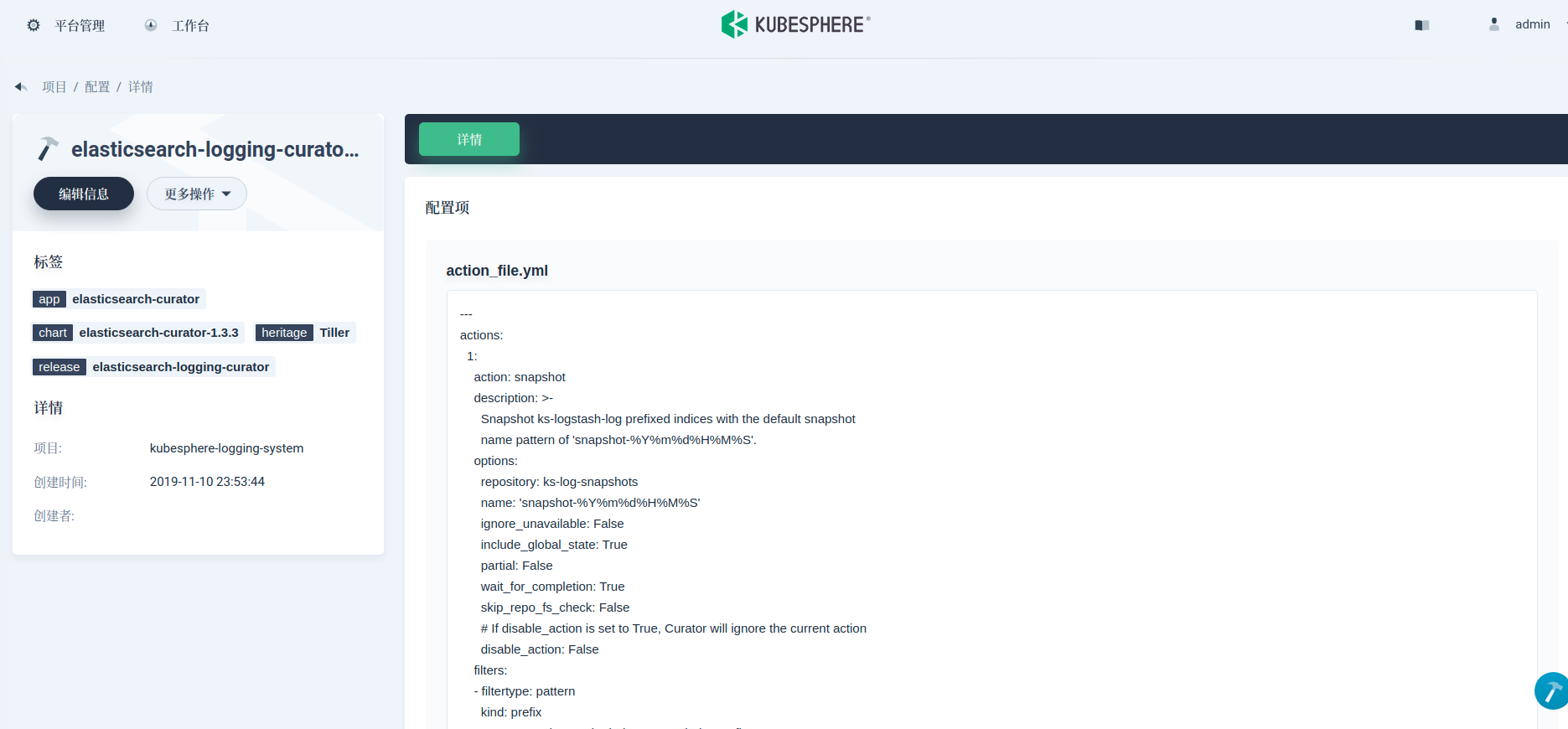 ElasticSearch Curator 能帮助管理 ElasticSearch 索引和快照。接下来,我们使用 Curator 来实现自动化定时日志备份。KubeSphere 日志组件默认包含了 Curator(被部署为一个 CronJob,每天凌晨 1 点执行)来管理索引,我们可以借助同一个 Curator。Curator 的执行规则在 ConfigMap 中可以找到。