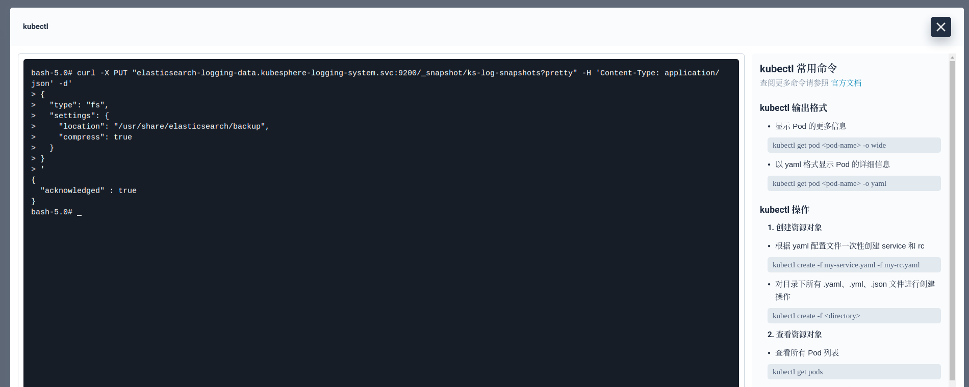 curl -X PUT "elasticsearch-logging-data.kubesphere-logging-system.svc:9200/_snapshot/ks-log-snapshots?pretty" -H 'Content-Type: application/json' -d'