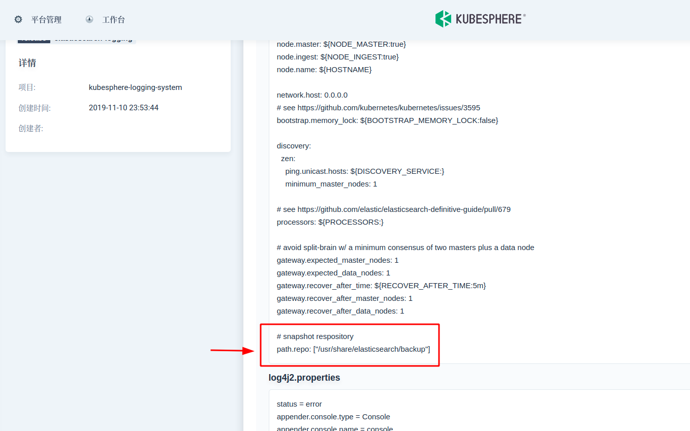 第二步,修改 elasticsearch.yml 配置文件,将 NFS 目录路径注册到各个主从节点。在 KubeSphere 中,elasticsearch.yml 配置在 ConfigMap elasticsearch-logging 里可以找到。在最后一行,添加 path.repo: ["/usr/share/elasticsearch/backup"]