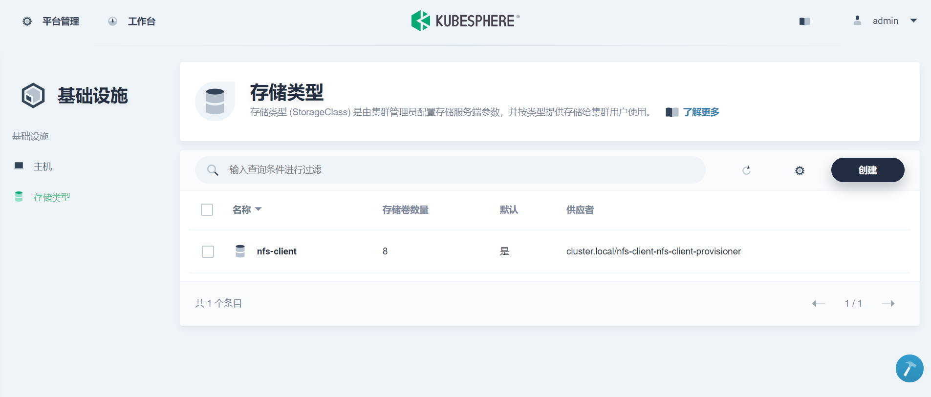 然后在 KubeSphere 环境上准备 NFS 类型的 StorageClass,后面我们为快照仓库申请 Persistent Volume 的时候会用到。本文环境已经在安装时配置了 NFS 存储,所以无需额外操作。有安装需要的读者请参考 KubeSphere 官方文档,修改 conf/common.yaml 并重新执行 install.sh 脚本。