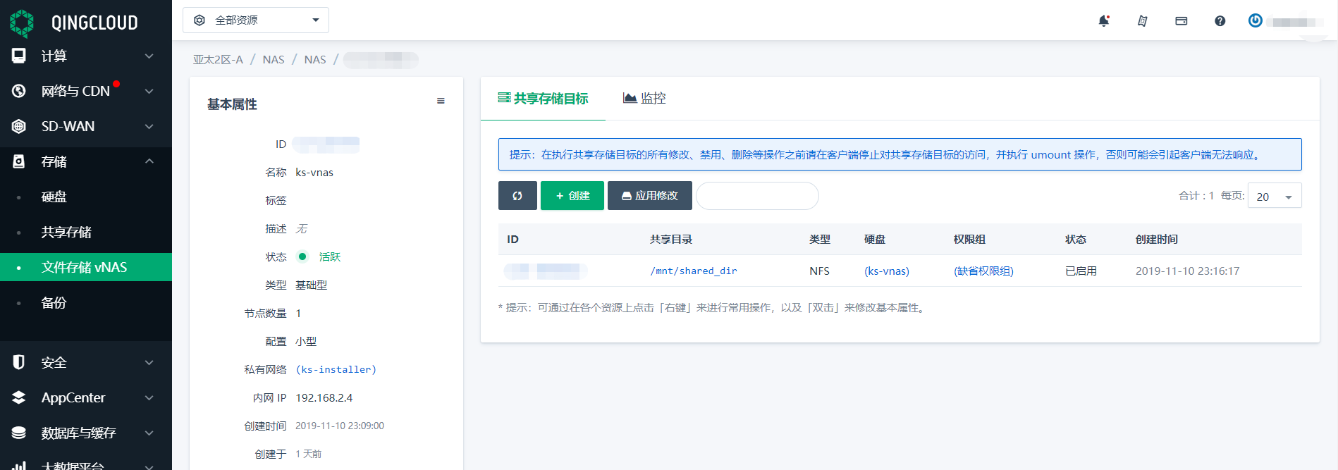 第一步,我们首先准备一个 NFS 服务端,例如本教程中使用的 QingCloud vNAS 服务,共享目录路径为 /mnt/shared_dir。